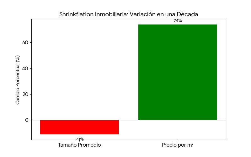 3. La “Shrinkflation” Inmobiliaria y la Muerte de la Vivienda Económica: Como mecanismo de defensa para mantener la viabilidad financiera de los proyectos sin que los precios finales excedan por completo la capacidad de deuda del segmento medio-alto, los desarrolladores han recurrido a una táctica importada del mercado de bienes de consumo masivo: encoger el producto mientras se aumenta el precio. Este fenómeno, bautizado como “shrinkflation inmobiliaria”, es ahora la norma.11 Según reportes sectoriales detallados, el 48.5% de las viviendas registradas en el país durante 2025 medían menos de 60 metros cuadrados.11 Peor aún, dentro de este universo, las unidades microscópicas de menos de 45 metros cuadrados ya representan el 10.3% del total nacional.11 En la retrospectiva de una década, las casas nuevas han menguado un 11% en su huella física, pero su precio por metro cuadrado ha explotado en un 74%.11